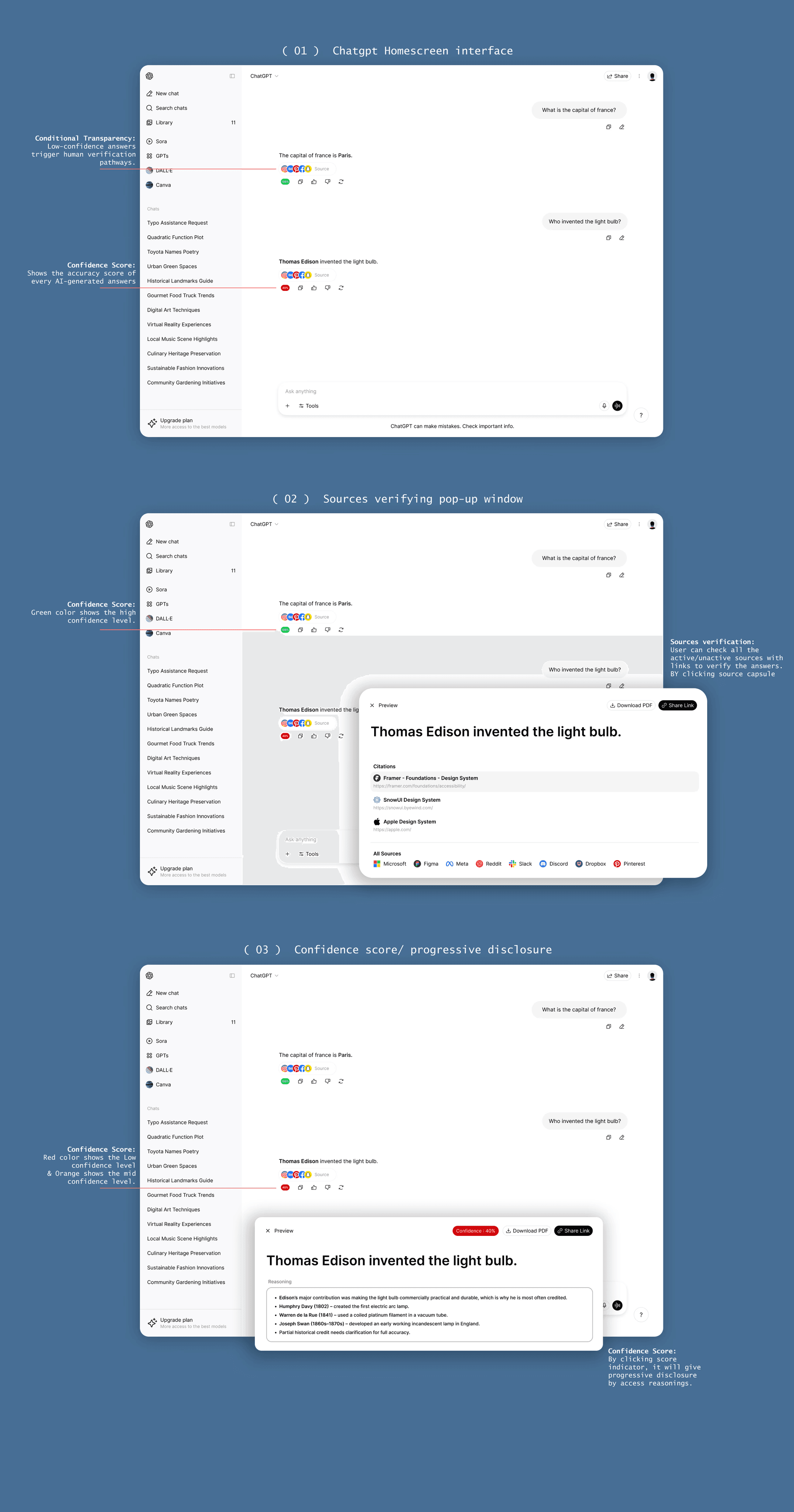 These wireframes will display clear, color-coded confidence indicators for every AI output. Transparency options, such as “How was this calculated?”, will always be accessible but unobtrusive. Trust tools will surface based on user actions, and verification options—including quick access to sources and expert help—will be seamless.